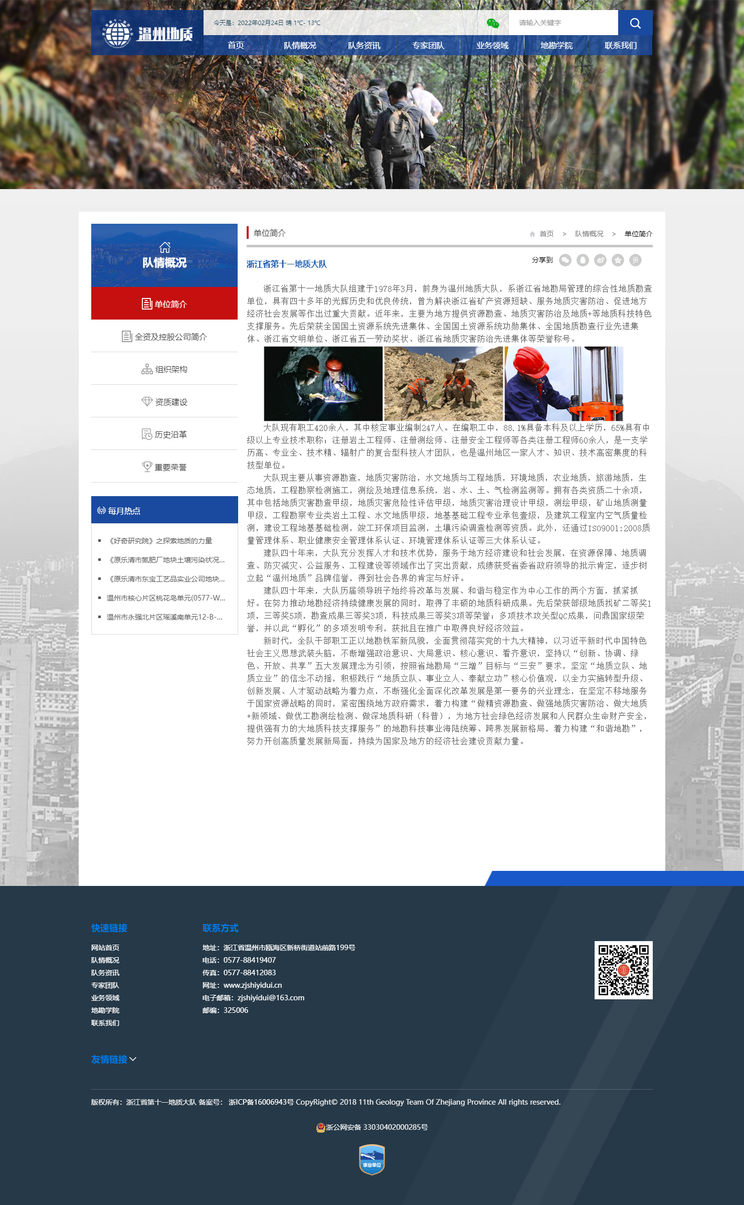 浙江省第十一地質(zhì)大隊組建于1978年3月,前身為溫州地質(zhì)大隊,系浙江省地勘局管理的綜合性地質(zhì)勘查單位,具有四十多年的光輝歷史和優(yōu)良傳統(tǒng),曾為解決浙江省礦產(chǎn)資源短缺、服務(wù)地質(zhì)災(zāi)害防治、促進(jìn)地方經(jīng)濟(jì)社會發(fā)展等作出過重大貢獻(xiàn)。近年來,主要為地方提供資源勘查、地質(zhì)災(zāi)害防治及地質(zhì)+等地質(zhì)科技特色支撐服務(wù)。先后榮獲全國國土資源系統(tǒng)先進(jìn)集體、全國國土資源系統(tǒng)功勛集體、全國地質(zhì)勘查行業(yè)先進(jìn)集體、浙江省文明單位、浙江省五一勞動獎狀、浙江省地質(zhì)災(zāi)害防治先進(jìn)集體等榮譽稱號。